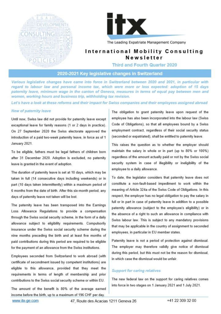 Various legislative changes have came into force in Switzerland between 2020 and 2021, in particular with regard to labour law and personal income tax, which were more or less expected: adoption of 15 days paternity leave, minimum wage in the canton of Geneva, measures in terms of equal pay between men and women, working hours and business trip, withholding tax revision. Let’s have a look at these reforms and their impact for Swiss companies and their employees assigned abroad
